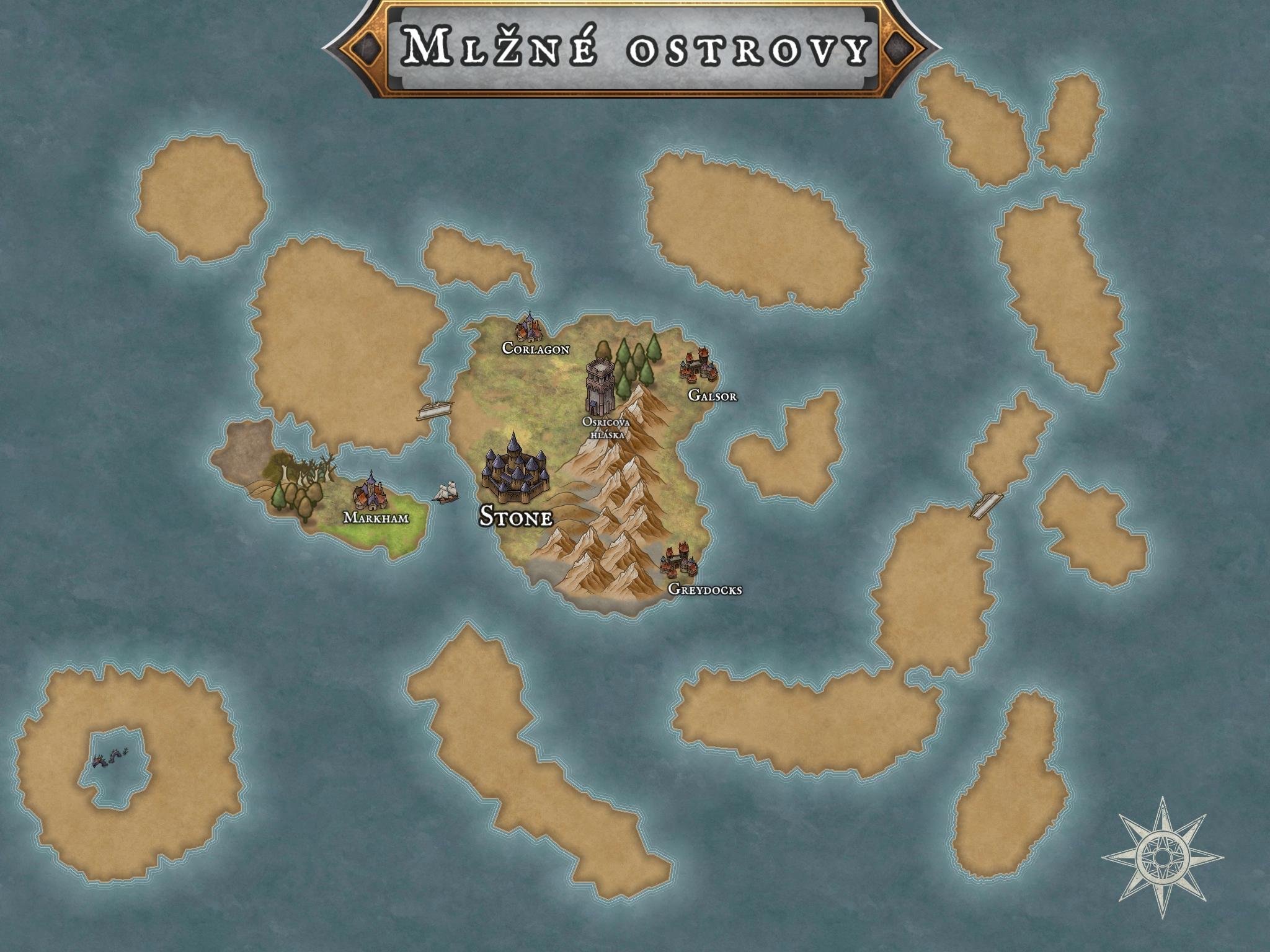 Na jichovýchodě a severovýchodě se nachází dva přístavy – Greydocks a Galsor, které zajišťují námořní spojení s východem archipelaga. Díky štítu hor mají celkem silnou autonomní samosprávu a od „těch ve Stone“ si nenechají do vládnutí moc kecat. Na severu ostrova je další přístav – Corlagon, který obhospodařuje sever archipelaga. Je to nástupní brána pro různé dobrodruhy mořeplavce, kteří se odtud vydávají na dlouhé plavby za bájnými(?) kontinenty na sever od archipelaga. Čas od času tu totiž moře vyvrhne podivné věci podivných tvarů a neznámých funkcí.